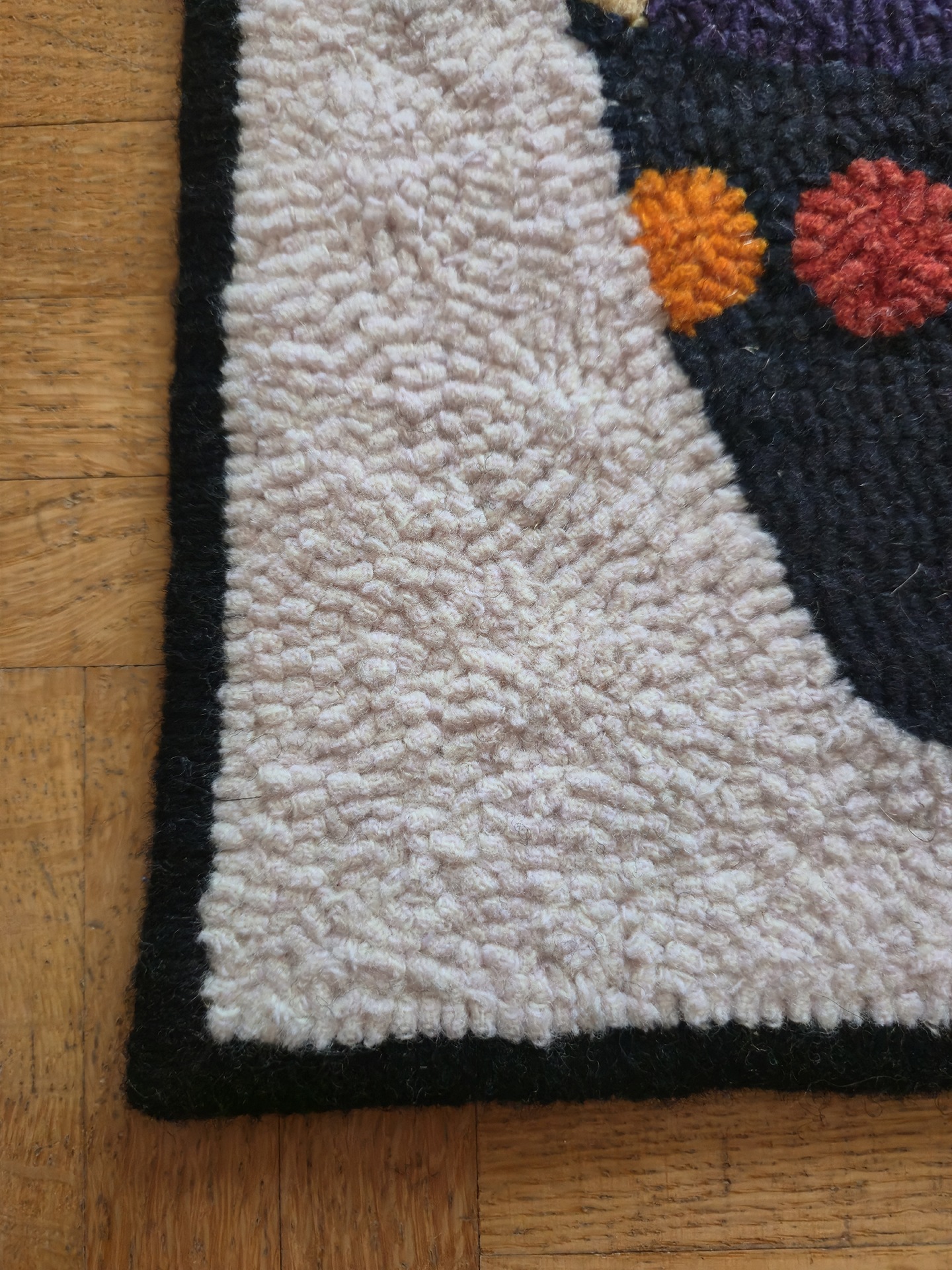 Come to class with two of your own pieces ready to finish (one with a cord and one to fold forward) or a hooked 5” x 5” square read to finish  – you will be able to finish two opposite corners with the different methods.  You should have 1.5” of backing around the piece(s) you want to finish.